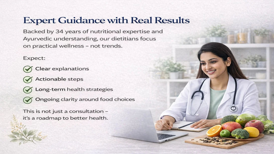Backed by 34 years of nutritional expertise and Ayurvedic understanding, our dietitians focus on practical wellness - not trends.